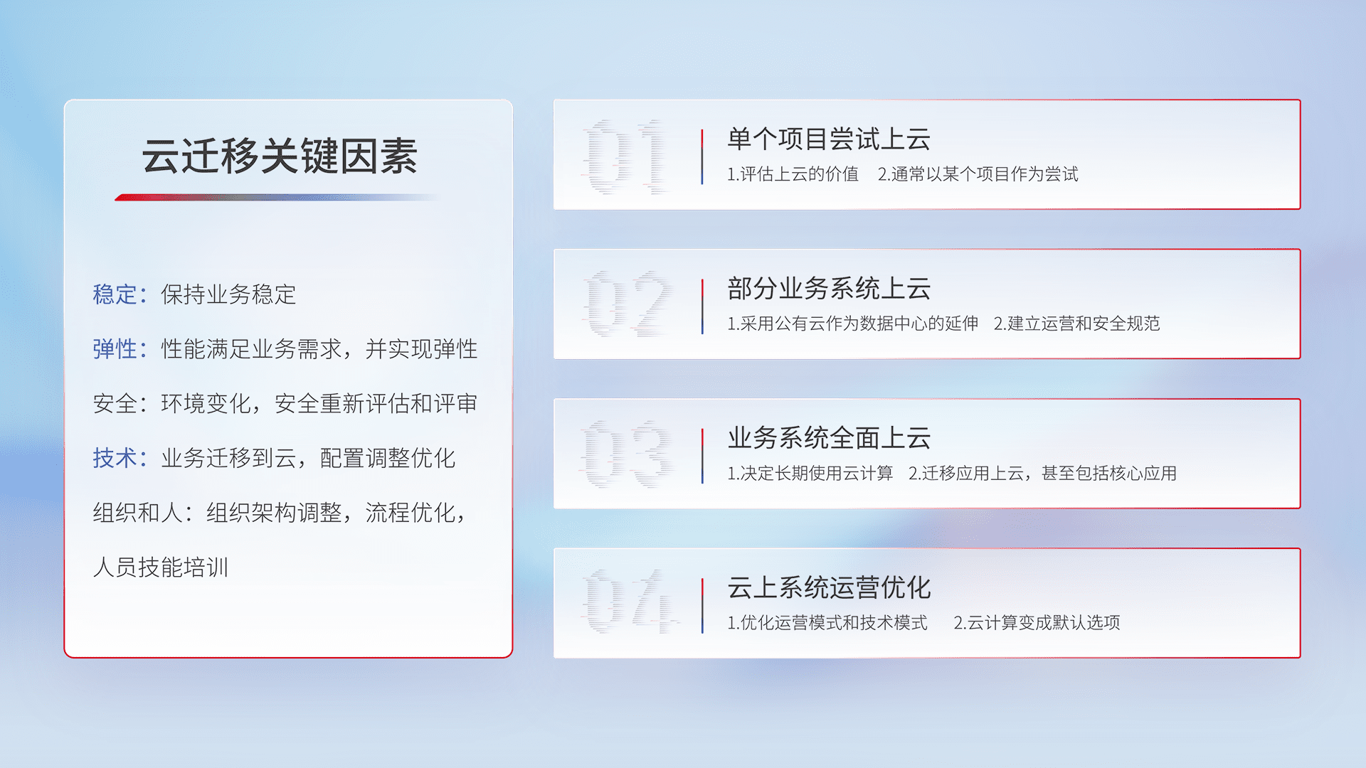 结合实际业务,,,从规划设计、、、云平台选型、、云原生改造、、、、数据迁移、、、、集成交付,,,,迁移全过程为客户识别最佳上云路径,,做好风险识别管理,,,设计网络架构、、、、身份权限、、安全审计合规、、操作审计、、、日志审计、、监控告警策略、、、、多站点容灾设计等,,,,对云上基础设施进行整体规划,,,,提升IT治理水平,,,,以满足弹性、、、高可用、、、、高性能的需求。。