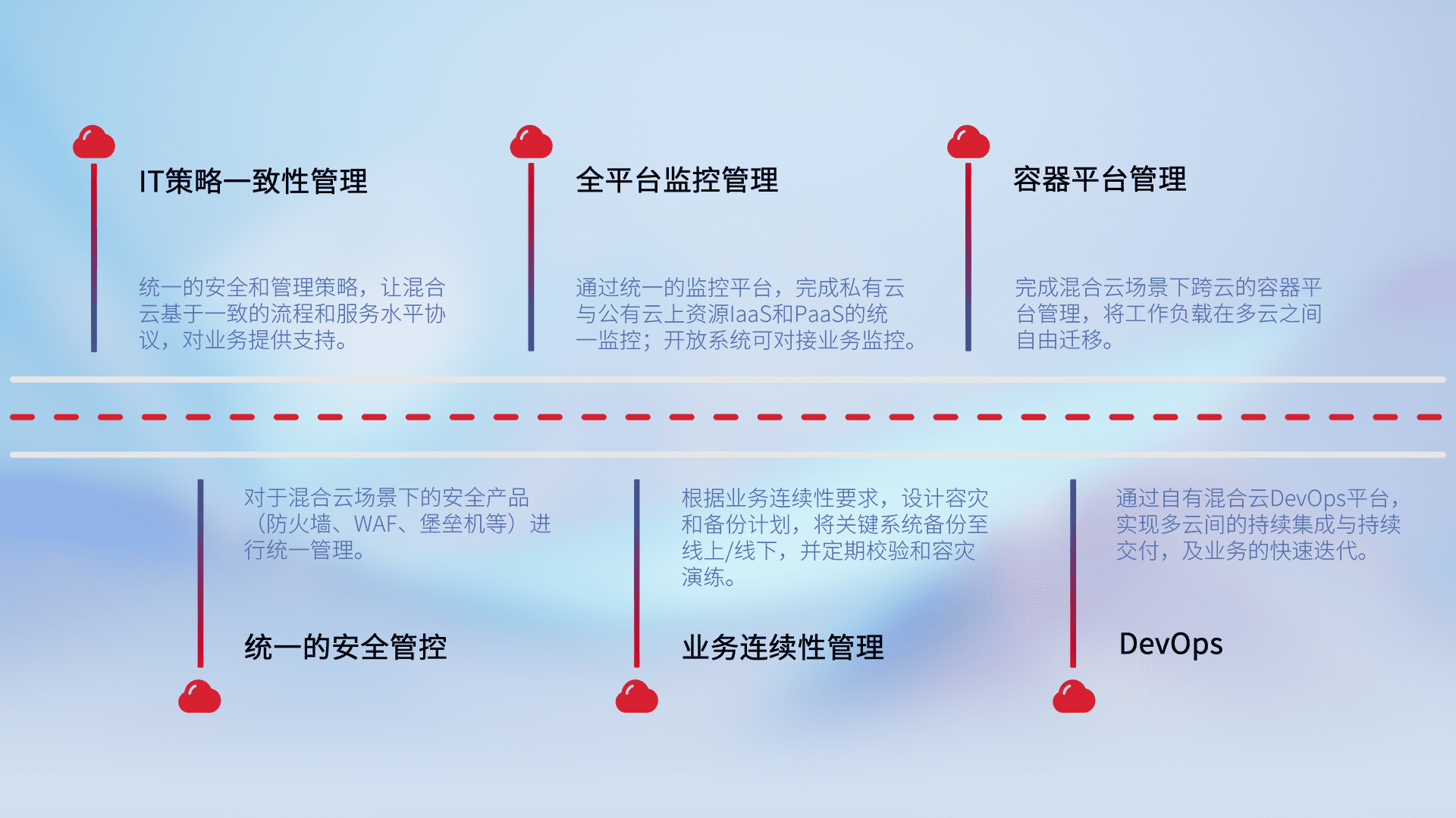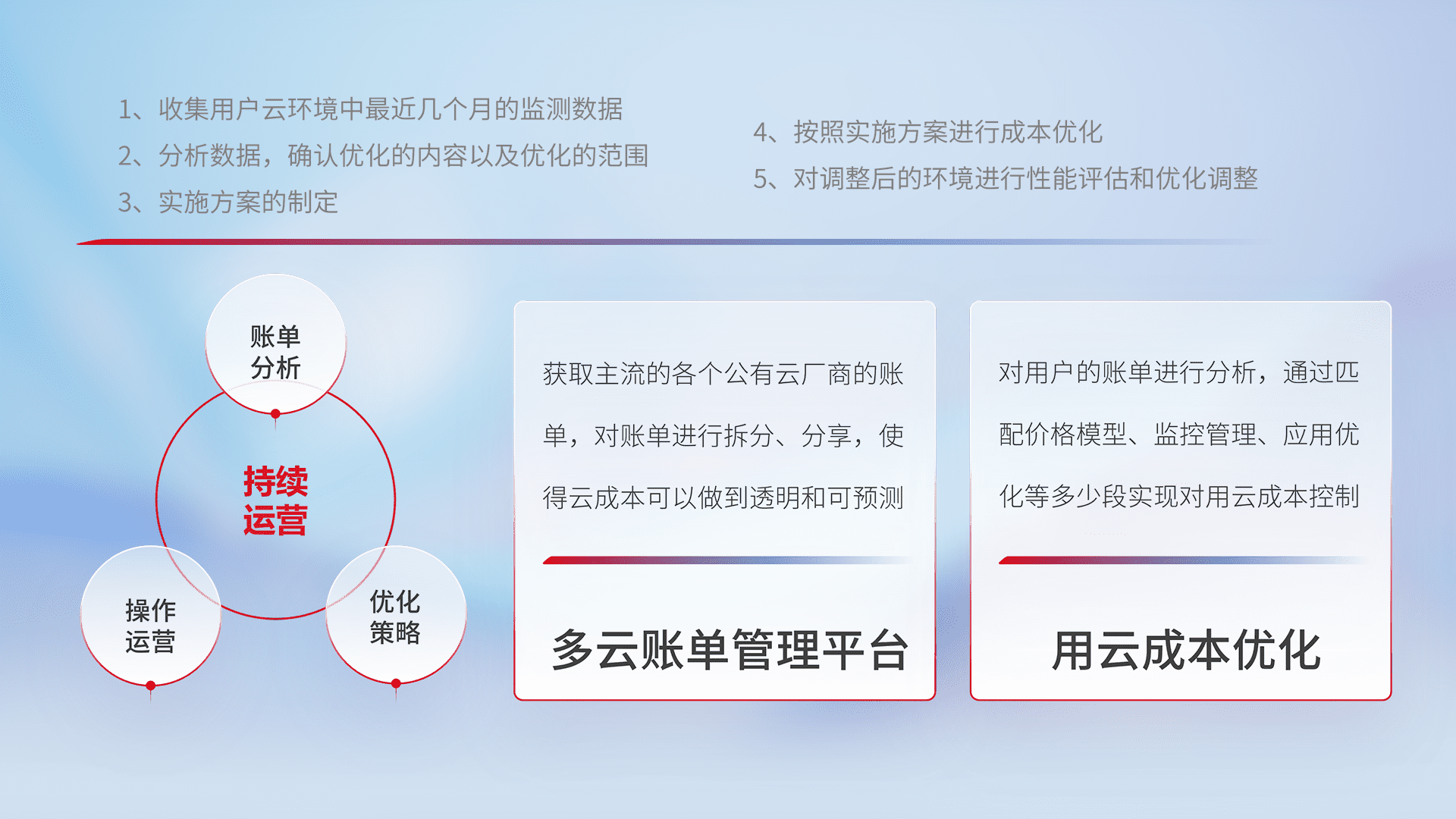 通过多云纳管,,,以统一的资源数据模型把客户的云资源进行抽象和封装,,,进而实现对多云资源的统一操作,,,保障云资源管理的可靠性、、、稳定性与可用性。。。。量身定制化运维内容,,,配置、、开发运维、、补丁管理、、、备份、、、、监控、、认证和访问管理、、、、审计和日常巡检等,,,,保障在用云过程中的可靠度,,,稳定度以及高可用率。。。。