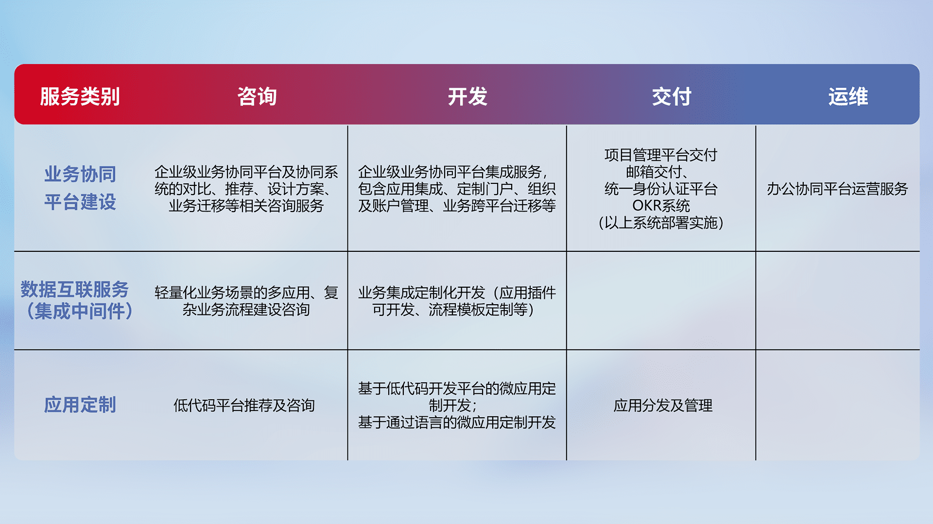针对钉钉、、、企微、、、、IDaas等平台级产品提供产品的规划、、、方案、、交付、、、、定制化开发等服务,,,实现如统一协同办公、、、智能客户服务、、混合会议管理、、智能数据查询、、、等业务场景,,实现数字化转型。。。。